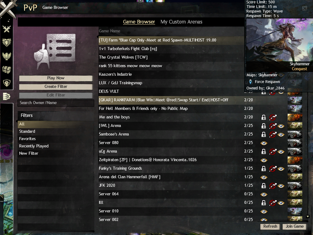 - PVP 内经常会有互刷房,可以很容易地完成日常。如下图中房间名带有 “Rankfarm” 或者 “Farm” 的都是。有的互刷房不允许杀人或者需要提前询问,请注意房间规则。